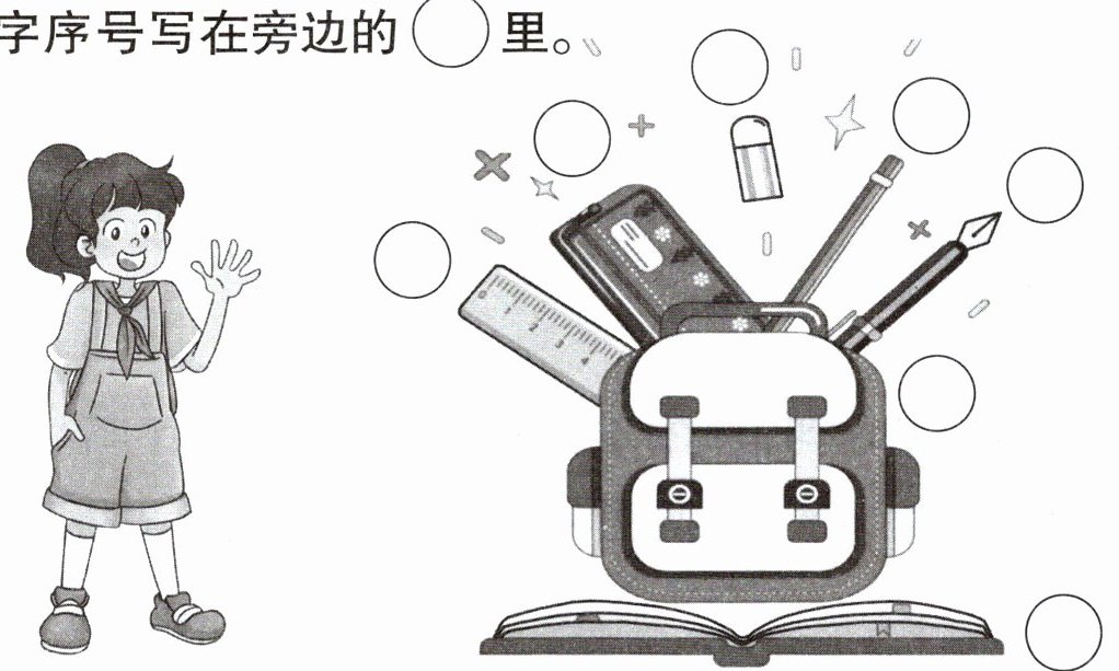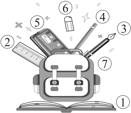 Nana 准备了新的学习用品。听录音,在下图中找到它们,将对应的数字序号写在旁边的 $◯$ 里。