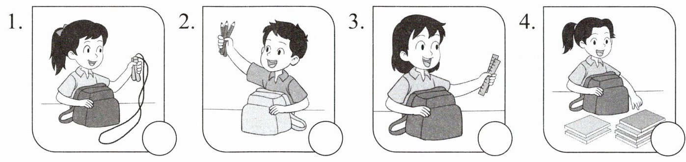 同学们正在做课前准备,根据图片选择对应的句子,将其字母序号写在 $◯$ 里。