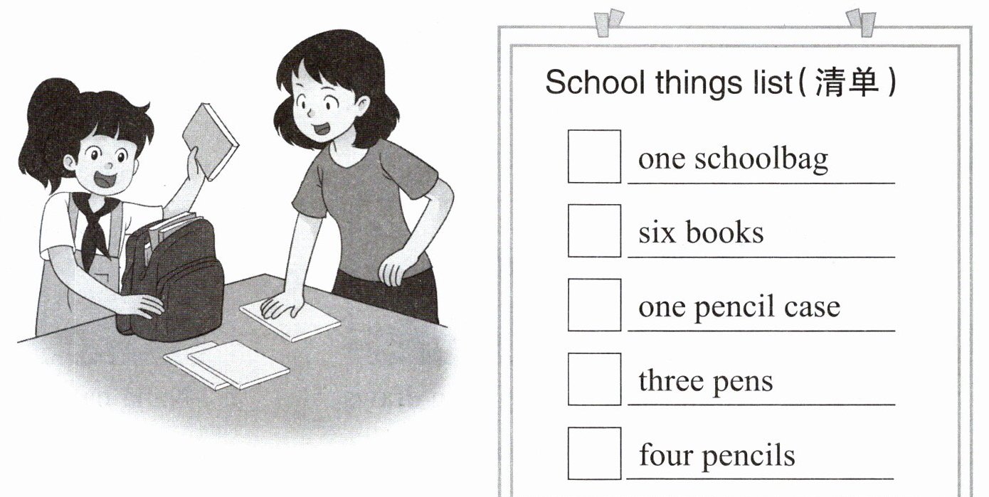 Nana 正在整理书包。听录音,判断学习用品的数量是否与清单内容相符,相符的在方框里画 “√” ,不相符的画 “×” 。