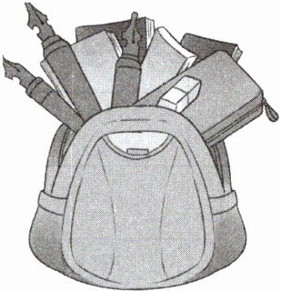 Look! This is my new (新的 ) schoolbag. It is ①____. I’ve got a ②____, an ③____, three ④____ and four books. My favourite thing is a card. What a nice schoolbag! I ⑤____ it.