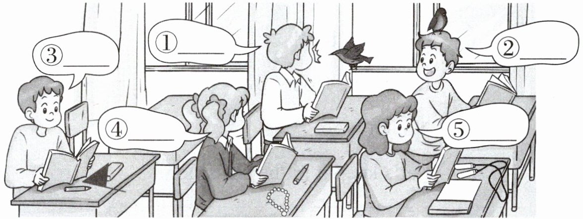 几天后,这只小鸟和它的妈妈又飞回了教室,还给小朋友们带来了礼物!看图,将合适句子的字母序号写在对应的横线上。
