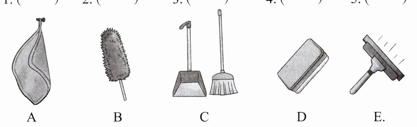 同学们正在打扫教室,分工合作效率高!听录音,将对应的劳动工具的字母序号写在括号里。