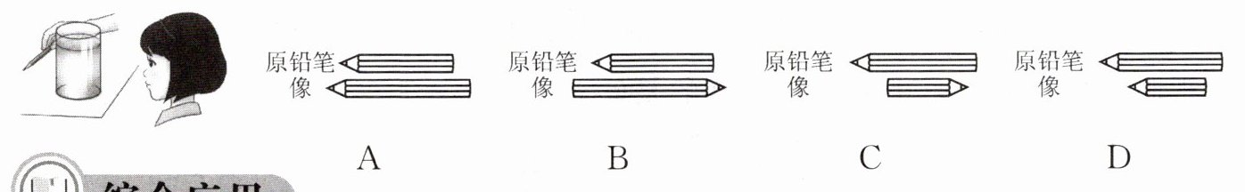 9. 找一个圆柱形的玻璃瓶,里面装满水。把一支铅笔放在玻璃瓶的一侧,透过玻璃瓶,可以看到这支笔,如图所示。如果把笔由靠近玻璃瓶的位置向远处慢慢移动,则透过玻璃瓶看到的像不可能是(