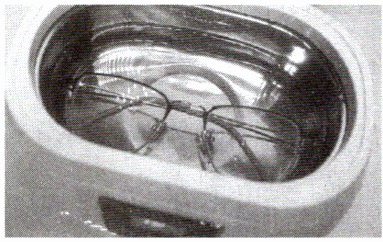 5.如图所示,超声波清洗机在清洗眼镜。使用时先向水槽中加水,使眼镜完全浸没在水中,通电后,清洗机开始工作。此清洗机工作时,人站在旁边能听到"嗞嗞"的声音。下列说法正确的是(