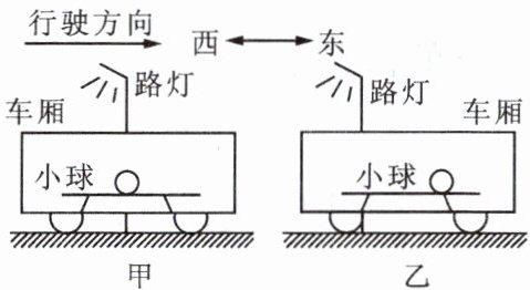 15. 列车车厢里被固定的桌子上有一颗小球,平直轨道旁有一个路灯,情景发生的先后顺序分别如图甲和图乙所示,则下列说法正确的是(