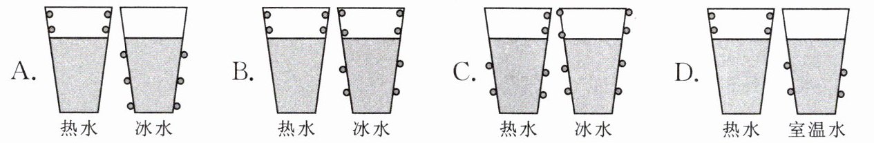 2. 某同学将热水、冰水和室温水(水温与室温相同)分别装入纸杯中,一段时间后,发现其中两只纸杯的杯壁上有小水珠出现(图中用小圆圈表示小水珠)。下列示意图正确的是(