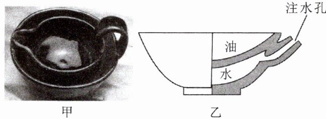 1. 如图所示,图甲为我国古代的“节能灯”——“省油灯”,图乙为其部分剖面示意图。向灯盏夹层内注水,有助于减慢油的蒸发,达到省油的目的。关于“省油灯”减慢油蒸发的原理,下列说法正确的是(