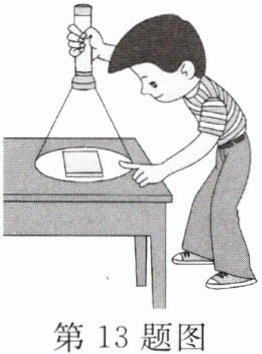 13.如图所示,在暗室的桌面上铺一张白纸,把一块小平面镜平放在纸上(镜面朝上),让手电筒正对平面镜照射。从侧面看去白纸