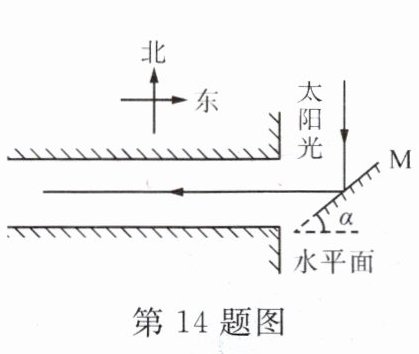 14.为了把太阳光反射到一座洞口朝向正东方向的水平涵洞中去,某同学设计安装了一块能自动调节方向的平面镜M,如图所示。正午时刻,太阳光垂直于水平地面照射,图中表示平面镜方向的角度α=