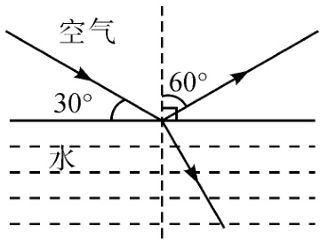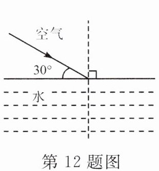 12. 如图,一束光从空气斜射到水面发生反射和折射,请在图中作出反射光线(标明反射角的度数)和折射光线的大致方向。