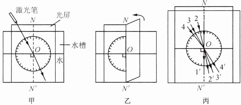 。(2)光从空气射入水中,入射点为O点,不断改变入射角,读出刻度盘上对应的折射角,将实验结果画在图丙中,其中1和1'、2和2'、3和3'、4和4'分别表示各次入射光线和对应的折射光线的位置。由此可得出,光从空气斜射入水中时,折射角随入射角的增大而