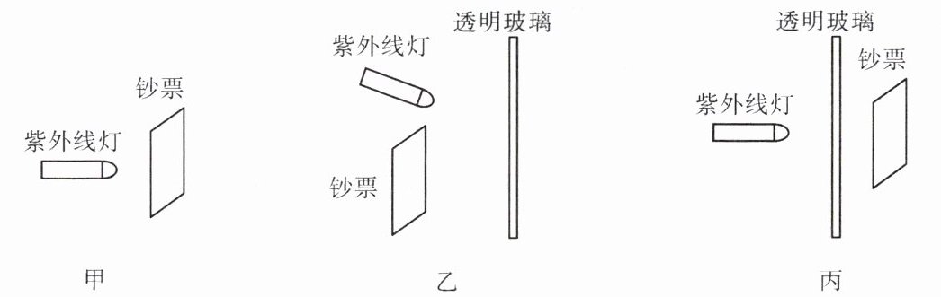 。(3)如图丙所示,他把这块透明玻璃放在紫外线灯和钞票之间,让紫外线灯正对透明玻璃照射,在另一侧无论怎样移动钞票,“100”字样都不发光。他做这次实验是为了探究