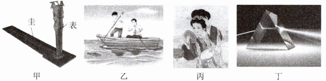 D. 图丁是一束太阳光通过三棱镜后产生彩色光带的画面,其原理是光的直线传播