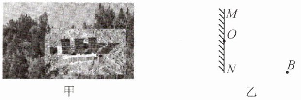 23. 靠近北极圈的挪威中部小镇尤坎镇四面环山,由于高山阻挡,每年9月到第二年的3月太阳光都照射不到小镇。现在,当地人在附近一座450 m高的山顶上竖起了三块巨大的平面镜,如图甲所示。这些平面镜由电脑控制,能跟踪太阳自动调整角度,确保太阳光被反射到镇中心广场,这样小镇的居民就能在镇中心广场感受到温暖的太阳光。如图乙所示,MN表示置于山顶的一块平面镜,B点表示广场上被照亮的某一位置。