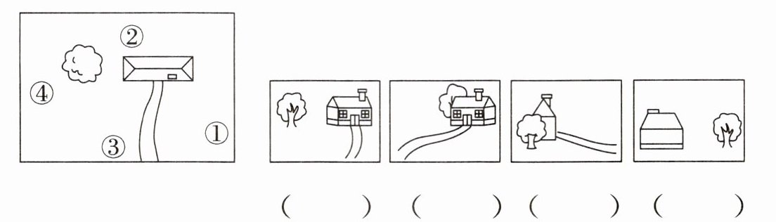 2. 下面的左图是在空中看到的奶奶家的房子图,房子周围有一棵大树,门前有一条小路。下面右边的四个画面分别是站在①②③④哪个位置看到的?填一填。