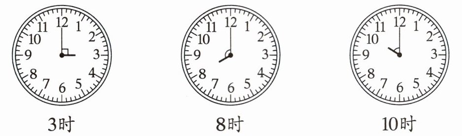 4. 下面钟面上时针和分针组成的角,是直角的画“√”,是锐角的画“$◯$”,是钝角的画“$\triangle$”。
