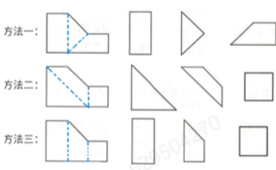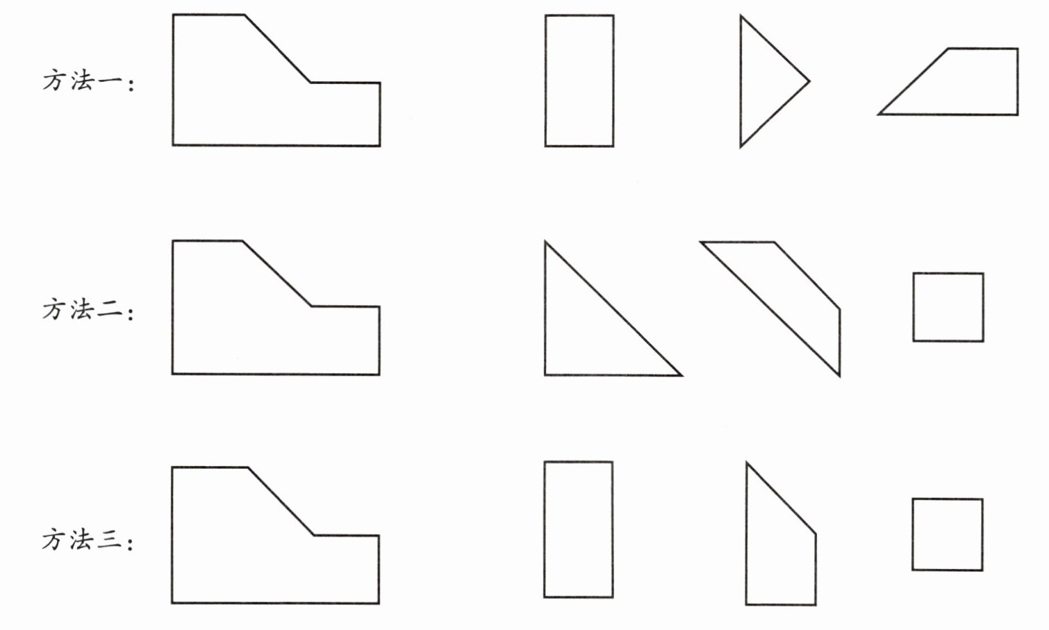 8. 笑笑用三种方法将下面的图形分割成3小块。你能按小块的样子,把每种方法用虚线在图形中画出来吗?