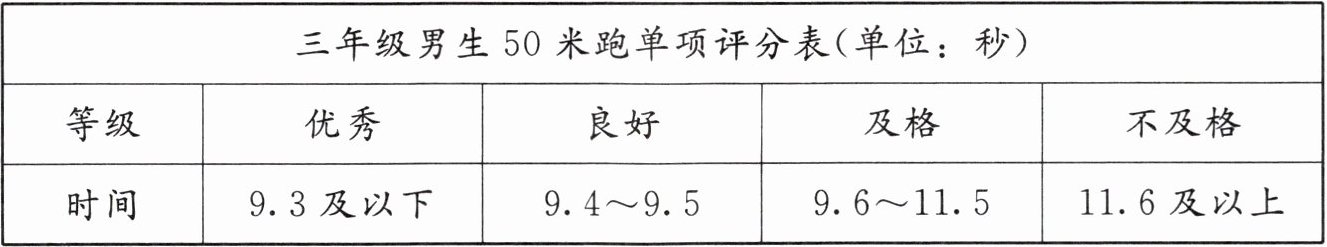 6. (数学应用)下表是三年级男生50米跑单项评分表。三年级四名男生进行了50米跑测试,成绩如下:明明8.5秒,华华9.5秒,聪聪9.2秒,壮壮11.4秒。
