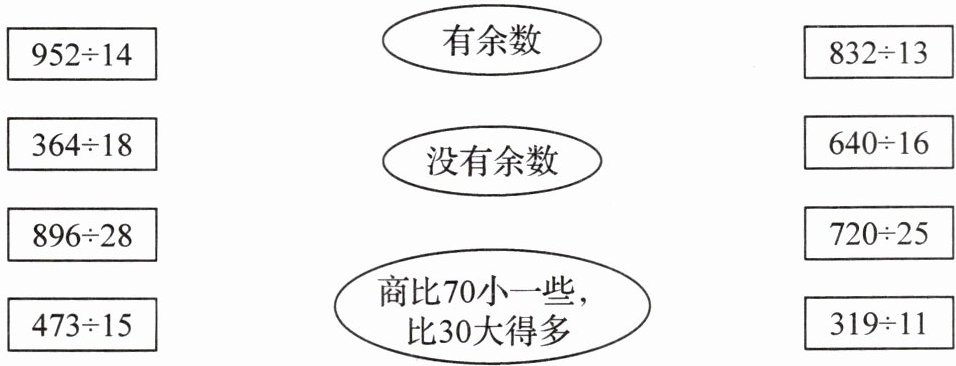 952÷14—商比70小一些,比30大得多;364÷18—有余数;896÷28—没有余数;473÷15—有余数;832÷13—商比70小一些,比30大得多;640÷16—没有余数;720÷25—有余数;319÷11—没有余数。