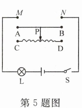 5. 在如图所示的电路中,用滑动变阻器调节灯的亮度,若要求滑片P向右端滑动时,灯逐渐变暗,则下列接法正确的是( )。