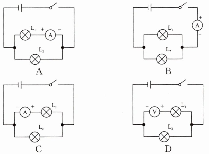 1. 下列图中能够直接测出灯$L_1$电流的电路是( )。
