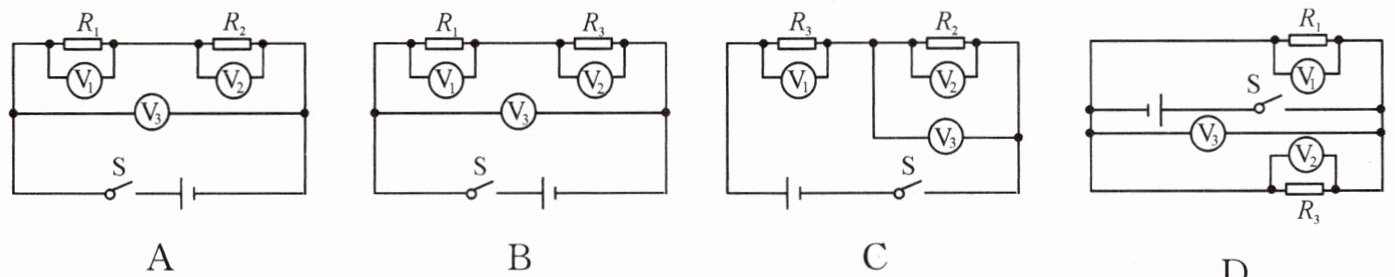 8. 在探究电路的电压规律时用了图中的某个电路,已知$R_1= R_2<R_3$,电压表$V_1$、$V_2和V_3$的读数分别为1.0 V、1.5 V和2.5 V。实验时的电路图应是( )。