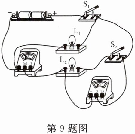 9. 在如图所示的电路中,闭合开关$S_1和S_2$,灯泡$L_1和L_2$均发光,下列说法正确的是( )。