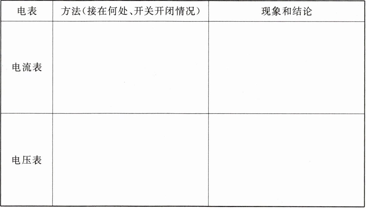 | 电表 | 方法(接在何处、开关开闭情况) | 现象和结论 |