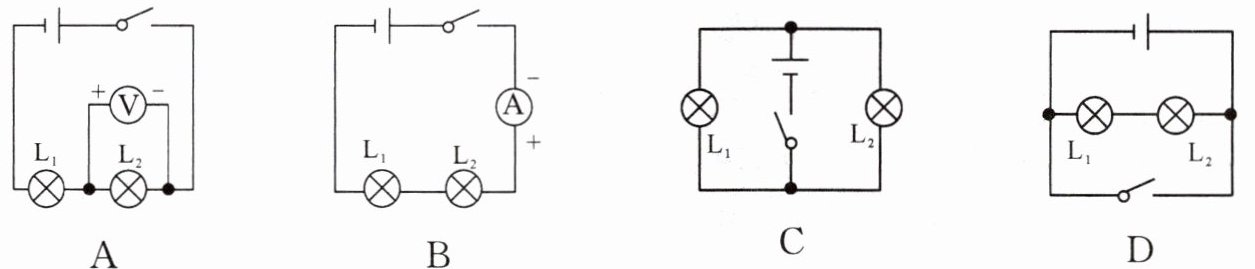 4. 如图,在“○”处可以连接电流表或电压表测量电路中的电流、电压,为使L₁与L₂串联,以下说法正确的是( )。