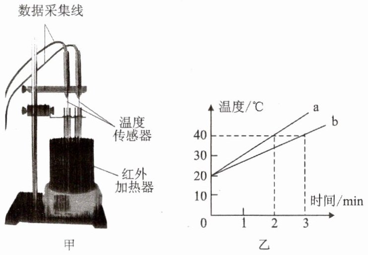 8. 小明用如图甲所示的装置比较不同物质吸热的能力。将分别盛有50 g水和50 g食用油的两个相同试管同时用红外加热器加热,温度传感器与电脑相连。电脑上显示温度随时间变化的图像如图乙所示,下列说法正确的是( )。$[c_{水}=4.2× 10^{3}\ J/(kg\cdot ^{\circ }C)]$