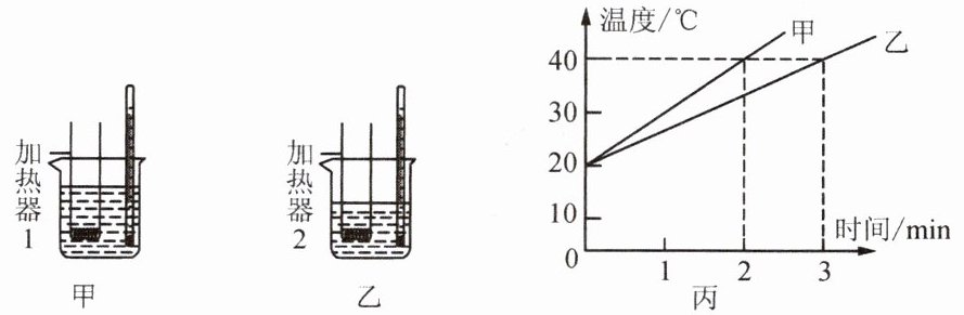 14. 如图,规格相同的甲、乙两容器中分别装有3kg和2kg的纯净水,并用不同加热器均匀加热,不计热损失,得到如图丙所示的水温随加热时间变化的图像,下列说法正确的是( )。