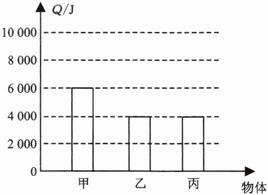 11. 甲、乙两物体质量都为1 kg,丙物体质量为2 kg,三个物体温度都升高$2\ ^{\circ }C$,吸收热量如图所示,根据图中信息可知,降低相同的温度,______放出的热量最多,乙的比热容为______$J/(kg\cdot ^{\circ }C)$,4 kg的丙物质温度升高$3\ ^{\circ }C$,需吸收______J的热量。