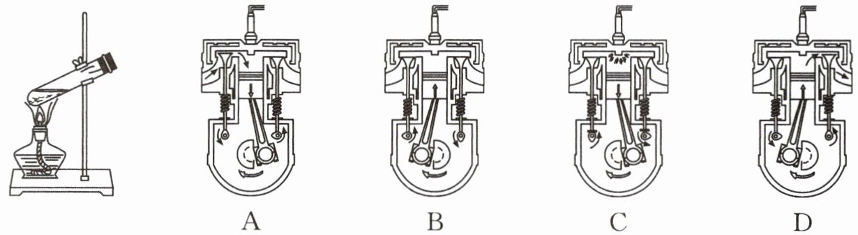 2. 如左下图所示,在试管内装些水,用橡胶塞塞住管口,对水加热。一段时间后,塞子受到水蒸气的压力会冲出去,这个过程与下图所示汽油机的四个冲程原理相同的是( )。