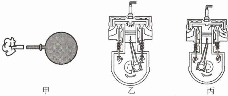 18. 如图甲,小明在吹气球时,被吹大了的气球没能用手握住,呼啸着飞了出去,若他及时拾起气球,将会感觉到它喷气的嘴部温度和原来相比______(选填“变高”“变低”或“没有变化”),这是因为当球内气体喷出来时,发生的能量转化情况是______能转化为______能。如图______(选填“乙”或“丙”)中汽油机的工作过程与这一过程中能量的转化是一致的。若某四冲程汽油机在工作时飞轮转速为 3600 r/min,则火花塞每秒点火______次。