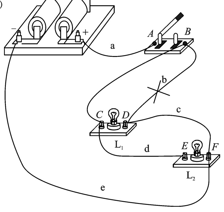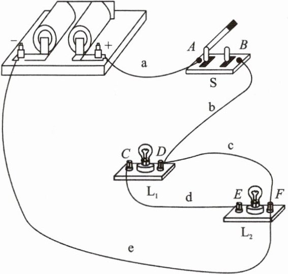(2)小刚同学想将电路全部拆散,重新连接。小强认为只需拆除c这一根导线,就能成为两灯 (选填“串联”或“并联”)的正确电路。小强将多余的c导线拆除以后,闭合开关S时,小灯$L_1、$$L_2$都不亮。用一段导线的两端接触A、B两点时,两灯都不亮;接触C、D两点时,两灯也不亮;接触E、F两点时,只有灯$L_1$亮。对此,下列说法正确的是( )。