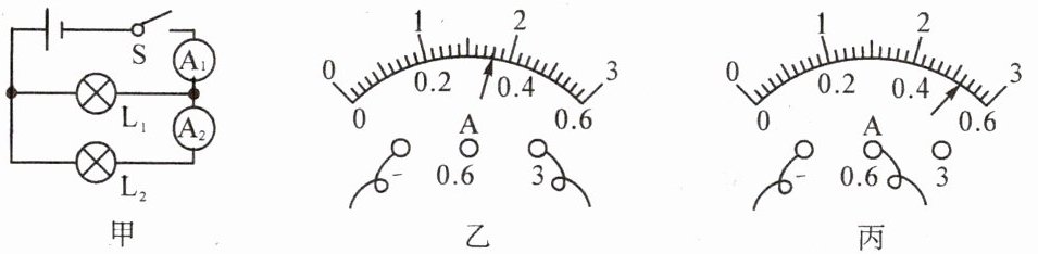 5. 如图甲,当开关S闭合时,两个电流表的示数分别由图乙、图丙读得,则灯泡$L_1$和$L_2$中的电流分别为( )。