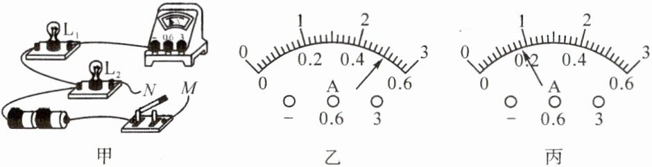 (2)将导线M、N两端如何连接,才能使电流表的示数最大?若此时,电流表的示数如图丙所示,则两次电流表示数相减,可得通过哪盏灯的电流?大小是多少?