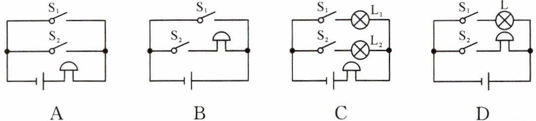 D:电源正极连接指示灯和电铃并联,并联后分两支,一支连接S₁,另一支连接S₂,两支汇合后到电源负极)