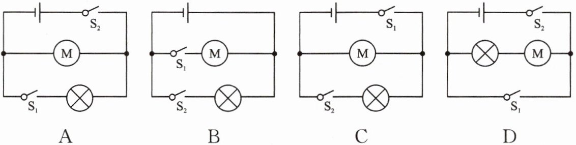 1. 目前,中国已经成为全球最大的无人机市场,相关技术引领全球。如图所示的无人机,当开关S₂闭合时,指示灯亮起,再闭合S₁电动机启动,无人机起飞。下列电路设计符合要求的是( )。