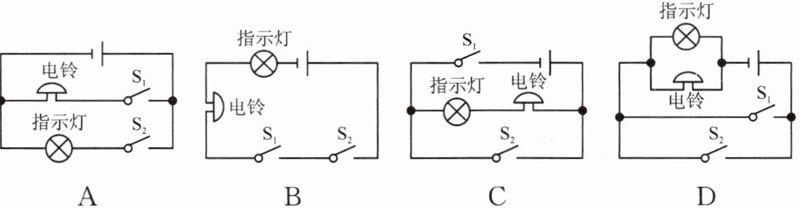 C:电源正极连接S₂,S₂另一端分两支,一支连接指示灯,另一支连接电铃和S₁串联,两支汇合后到电源负极;