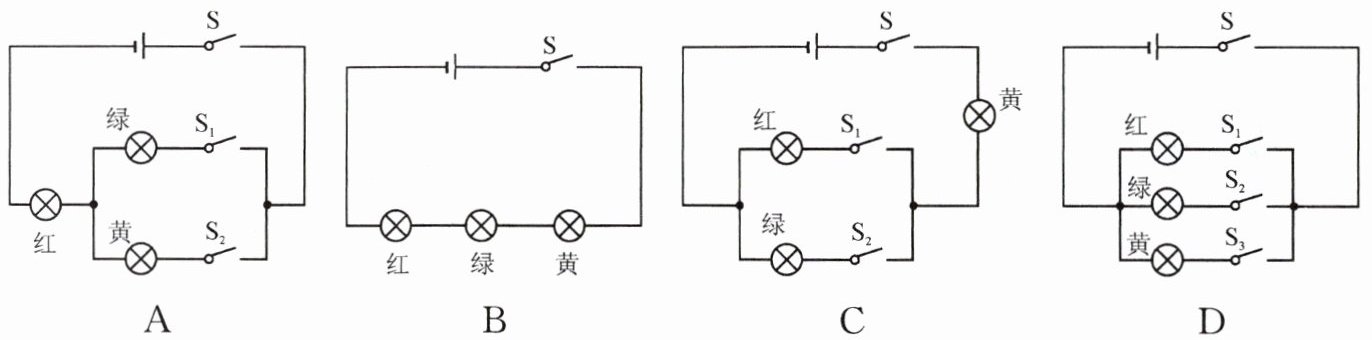 6. 交通路口要遵守“红灯停,绿灯行,黄灯也要等一等”的规则,使用小灯泡、电池、开关和导线来模拟路口的交通信号灯,要求红、绿、黄灯可独立发光。如图所示的电路图设计中符合题意的是( )。