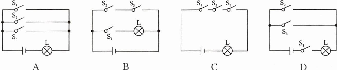 A:电源正极分三支,分别连接S₁、S₂、S₃,三支汇合后连接灯泡L,L另一端到电源负极;