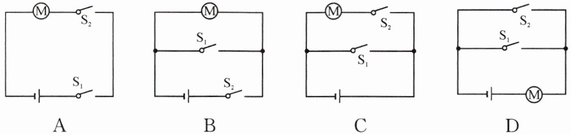 D:电源正极连接电动机M,M另一端分两支,一支连接S₁后到电源负极,另一支连接S₂后到电源负极)
