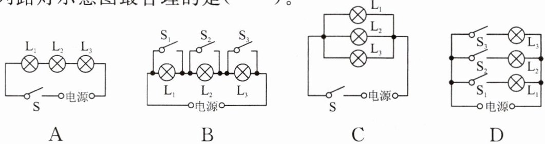 D:电源一端连接三个开关S₁、S₂、S₃,每个开关分别与对应的路灯L₁、L₂、L₃串联,串联后并联到电源另一端)