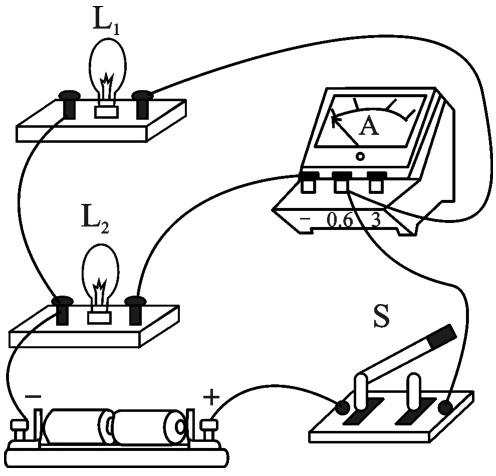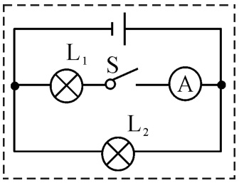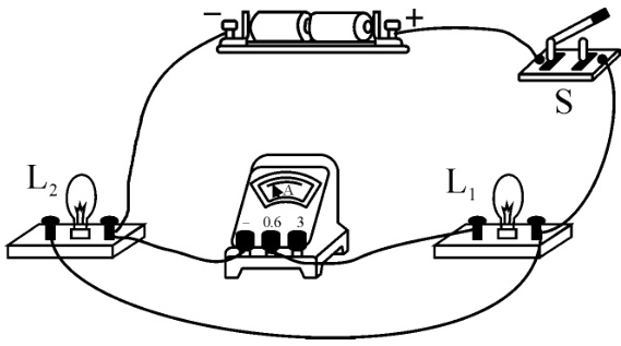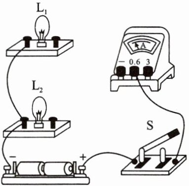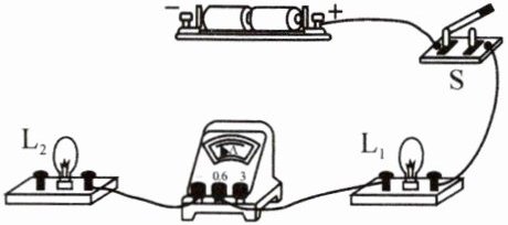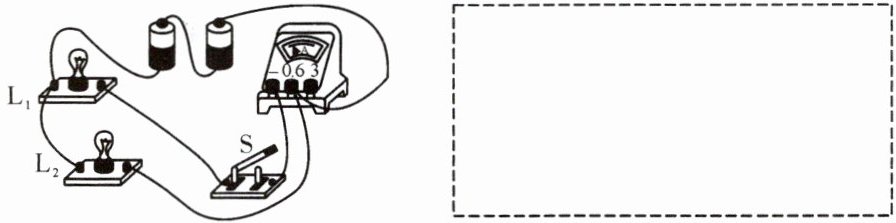 7. 在如图所示的电路中,有两根导线尚未连接,请用笔画线代替导线补上。补上后要求:闭合开关S后,灯$L_1$和$L_2$都能发光,且电流表只测量通过灯$L_2$的电流。