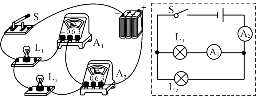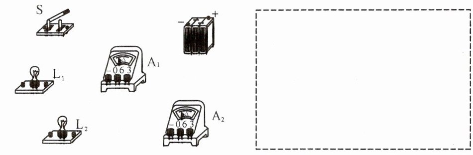 11. 现有如图所示的器材,要求设计一个电路,使灯泡$L_1、$$L_2$并联,电流表$A_1$测灯泡$L_1$的电流,电流表$A_2$测干路中的电流,开关同时控制两盏灯。请按要求在图中把实物连接起来(两灯泡电流均为0.4 A),并在虚线框中画出相应电路图。