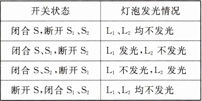 | 闭合S、$S_1,$断开$S_2 $|$ L_1$发光$,L_2$不发光 |