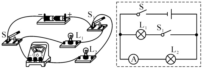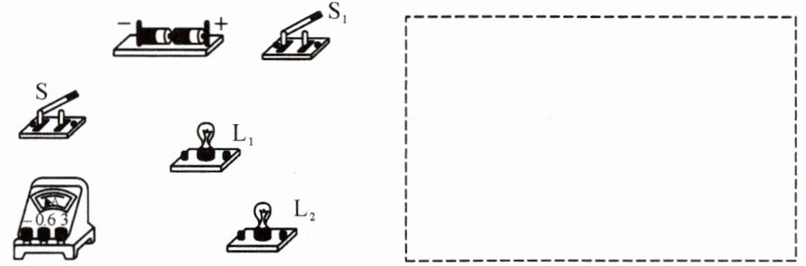 8. 利用如图所示的元件组成电路,要求:①开关S控制两灯;②开关$S_1$只控制灯$L_1;$③电流表只测通过灯$L_2$的电流。在虚线框中按要求画出电路图,并用笔画线代替导线连接图中的元件。
