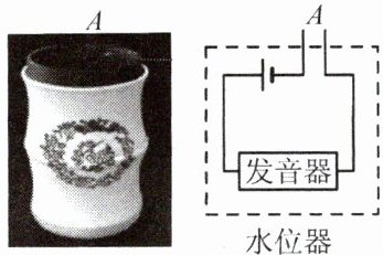 4. 小明同学设计并制作了一个“盲人水杯”,其工作原理如图所示。杯中近杯口处A点是水位器的两个金属触点,当杯中的水位达到A位置时,水位器会发出音乐声,表示水已盛满。杯口处的两个金属触点的作用相当于( )。