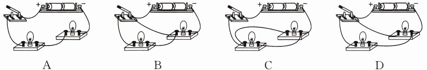 5. 下图所示的电路中,有一只灯泡被短接的是( )。